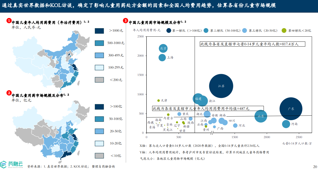 中国儿童用药市场整体规模:通过真实世界数据和KOL访谈,确定影响儿童用药处方金额的因素和全国人均费用趋势,估算各省份儿童市场规模,进而放大推算全国整体市场规模。