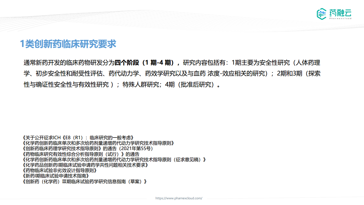 1类创新药的临床研究遵循四个阶段(I-IV期)的经典模式。I期主要关注安全性、耐受性、药代动力学和药效学;II期和III期进行探索性和确证性研究,评估安全性与有效性,并开展特殊人群研究;IV期为上市后研究。 相关指导原则包括《关于公开征求ICH《E8(R1):临床研究的一般考虑》》、《化学药创新药临床单次和多次给药剂量递增药代动力学研究技术指导原则》等多个文件。