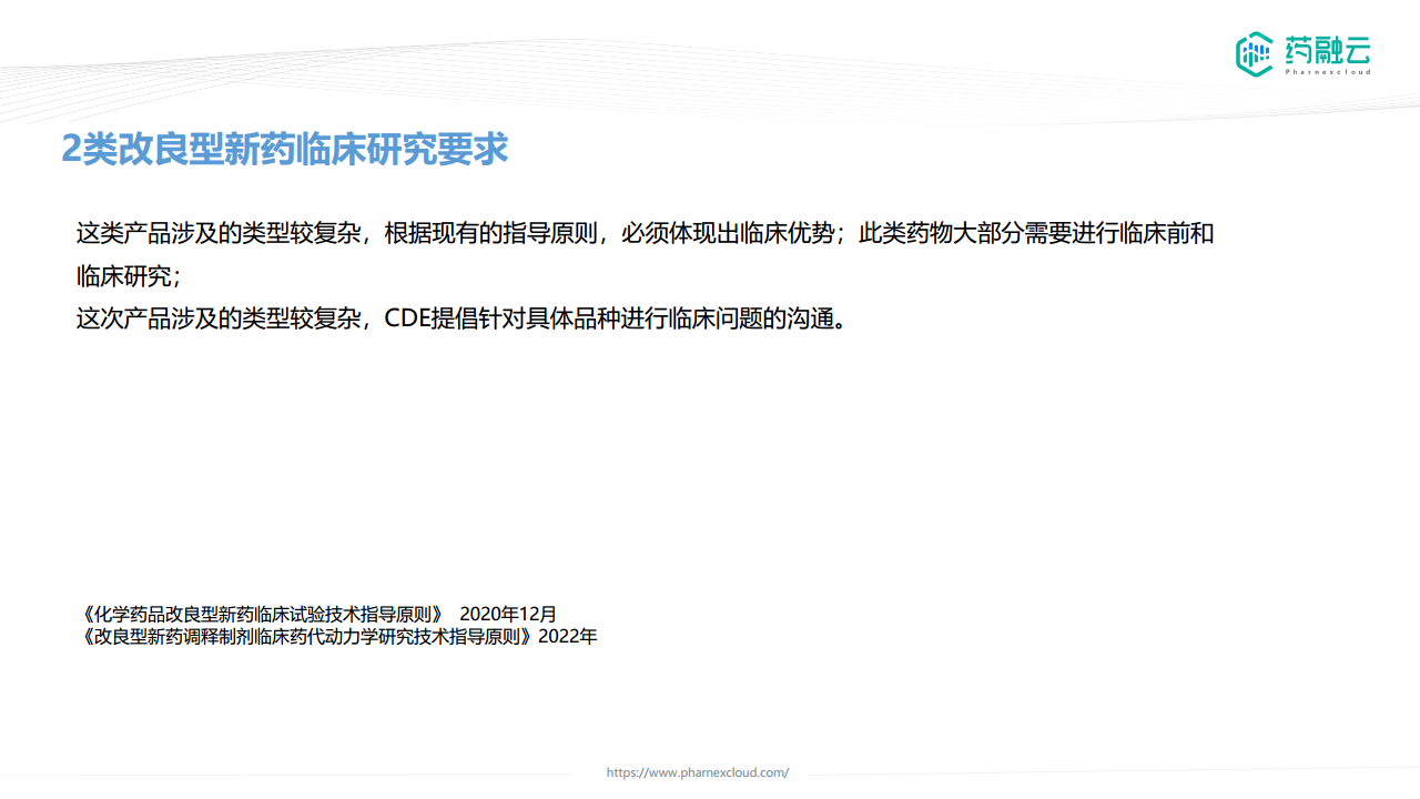 2类改良型新药需要体现临床优势,通常需要进行临床前和临床研究。由于产品类型复杂,CDE提倡针对具体品种进行临床问题的沟通。相关指导原则包括《化学药品改良型新药临床试验技术指导原则》和《改良型新药调释制剂临床药代动力学研究技术指导原则》。
