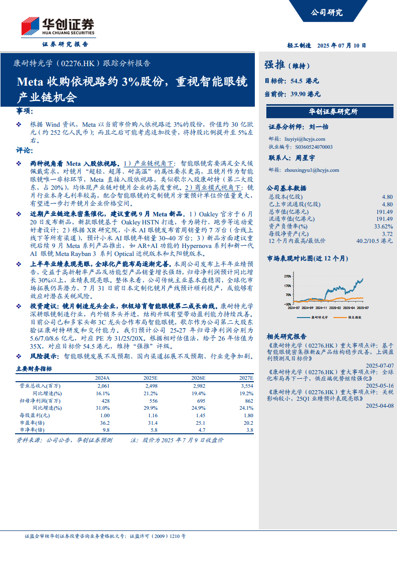 康耐特光学(02276):Meta收购依视路约3%股份,重视智能眼镜产业链机会