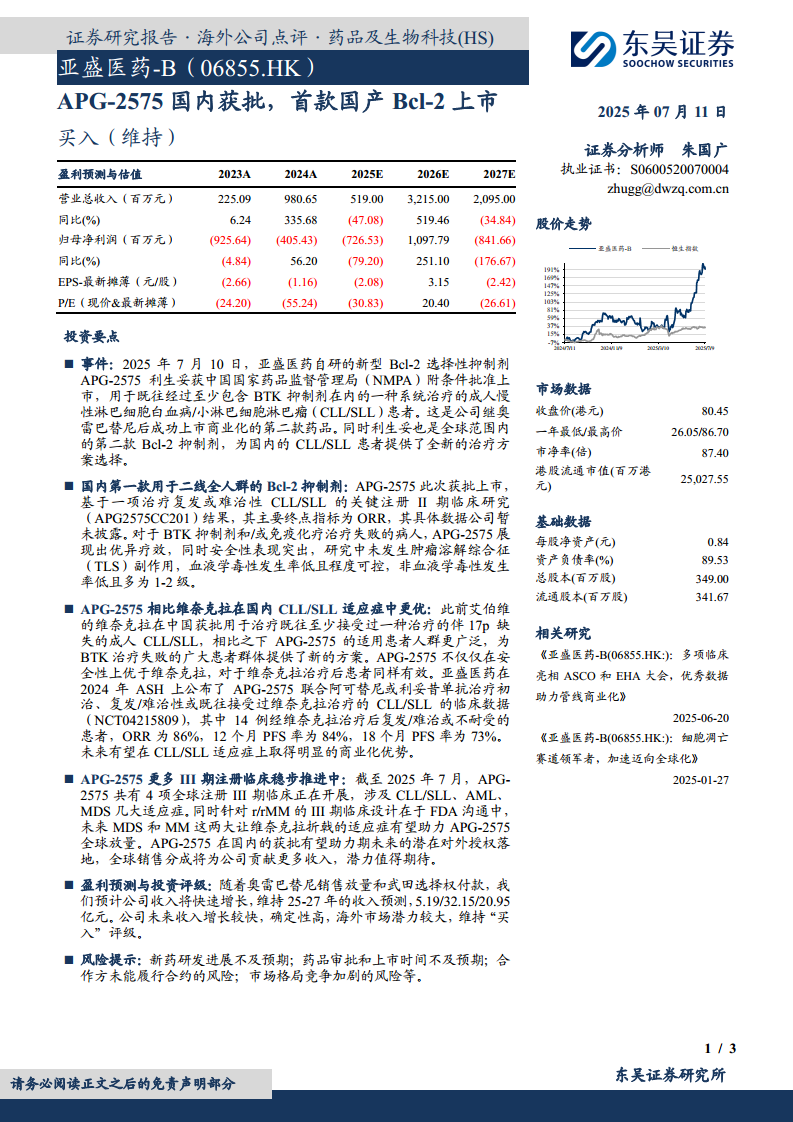 亚盛医药-B(06855):APG-2575国内获批,首款国产Bcl-2上市