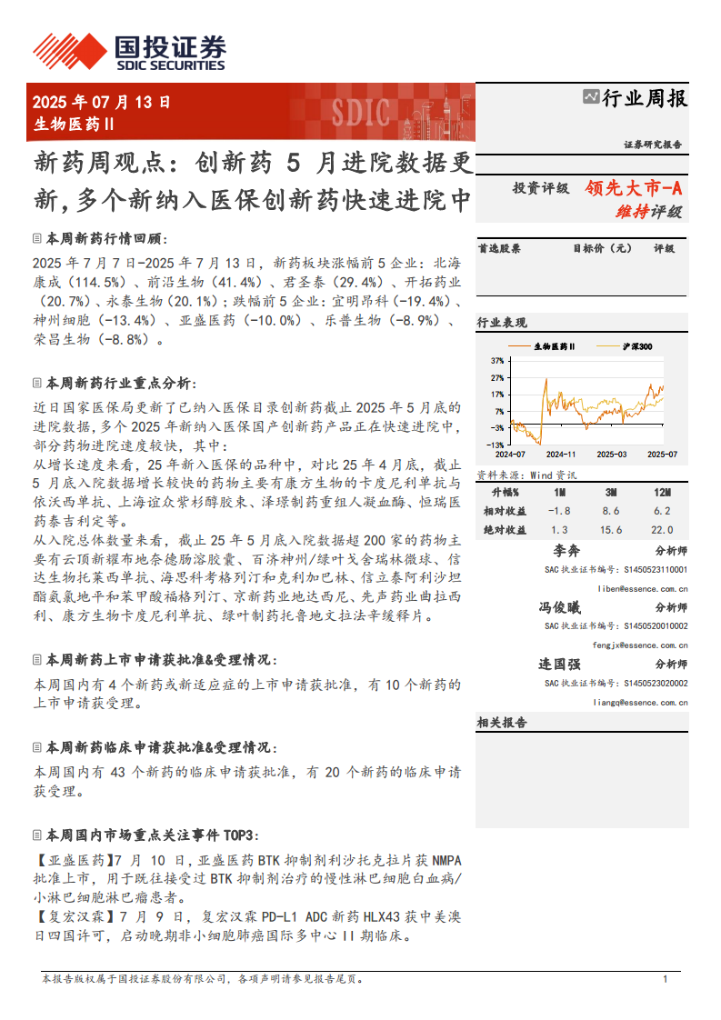 新药周观点:创新药5月进院数据更新,多个新纳入医保创新药快速进院