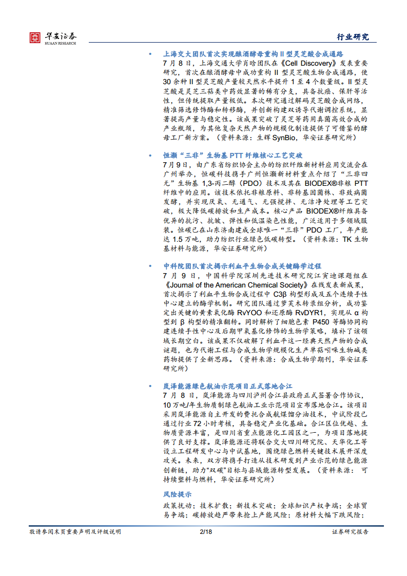 华安证券化工团队发表的《合成生物学周报》是一份面向一级市场、二级市场,汇总国内外合成生物学相关领域企业信息的行业周报。目前生命科学基础前沿研究持续活跃,生物技术革命浪潮席卷全球并加速融入经济社会发展,为人类应对生命健康、气候变化、资源能源安全、粮食安全等重大挑战提供了崭新的解决方案。国家发改委印发《“十四五”生物经济发展规划》,生物经济万亿赛道呼之欲出。