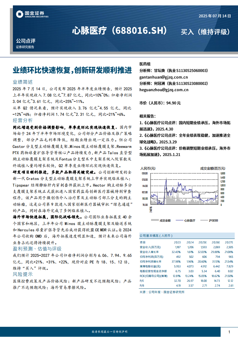 心脉医疗(688016):业绩环比快速恢复,创新研发顺利推进