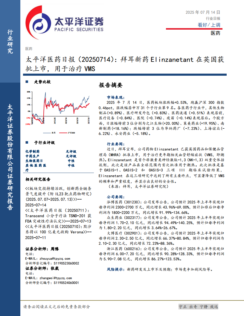 太平洋医药日报:拜耳新药Elinzanetant在英国获批上市,用于治疗VMS