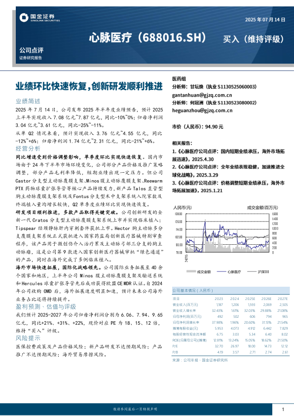 心脉医疗2025年上半年业绩受到短期因素影响,但Q2单季度已呈现环比恢复态势。公司在创新研发方面持续投入,多款新产品上市并获得重要认证,国际化战略也在加速推进。尽管面临医保控费、研发风险等挑战,但公司凭借核心产品和新产品的驱动,以及海外市场的拓展,长期发展前景依然值得期待。维持“买入”评级,需关注相关风险因素。