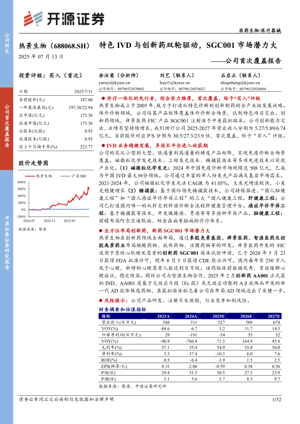 热景生物成立于2005年,致力于打造从特色诊断到创新制药的全产业链发展战略。体外诊断领域,公司仪器产品矩阵覆盖体外诊断全场景,试剂特色项目突出。创新药领域,舜景医药FIC产品SGC001注射液于中美获批临床。公司创新能力突出,业绩有望持续增长,我们预计公司2025-2027年营业收入分别为5.27/5.89/6.74亿元,当前股价对应P/S分别为30.5/27.3/23.9倍,首次覆盖,给予“买入”评级。