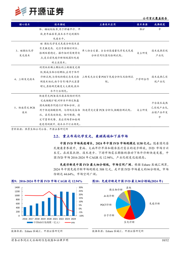 公司构筑从小型到大型、低通量到高通量的梯度产品矩阵,实现免疫诊断全场景覆盖。磁微粒化学发光技术、上转发光技术、糖捕获技术等多项先进技术以实现产业化。(1)磁微粒化学发光:2024年中国免疫诊断市场规模达508亿元,已成为中国IVD最大细分领域。公司通过丰富的单人份发光产品满足基层市场需求。2021-2024年,公司磁微粒化学发光法CAGR为41.05%,大发光增速较快,小发光稳健增长(2)糖捕获:基于国际领先糖捕获技术,公司持续推进、“国人脑健康工程”和“国人癌症早诊早筛工程”的三大“国人健康工程。肝健康工程:公司已打造国内唯一的从肝炎到肝癌诊断全流程肝健康管理平台。癌症早诊早筛工程:基于糖捕获等技术,开发胰腺癌、胃癌等等多癌种早筛产品。脑健康工程:前瞻布局阿尔茨海默病、帕金森病等脑病的诊疗体系。