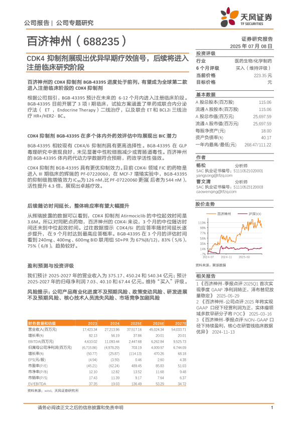 我们预计2025-2027年的营业收入为375.17、450.24和540.34亿元;预计2025-2027年的归母净利润7.03、40.10和67.44亿元。维持“买入”评级。风险提示:公司产品商业化进度不及预期风险、政策变动风险、研发进展不及预期风险、核心技术人员流失风险、市场竞争加剧风险