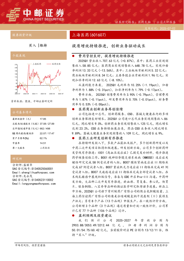 上海医药在2025年第一季度通过提质增效和费用管控保持了稳健的经营态势。创新业务的快速增长为公司业绩提供了有力支撑,医药工业的研发创新也在有序推进。维持“买入”评级,主要基于公司在医药商业和工业领域的综合实力以及未来的增长潜力。投资者应关注研发进度和合作进展等风险因素。