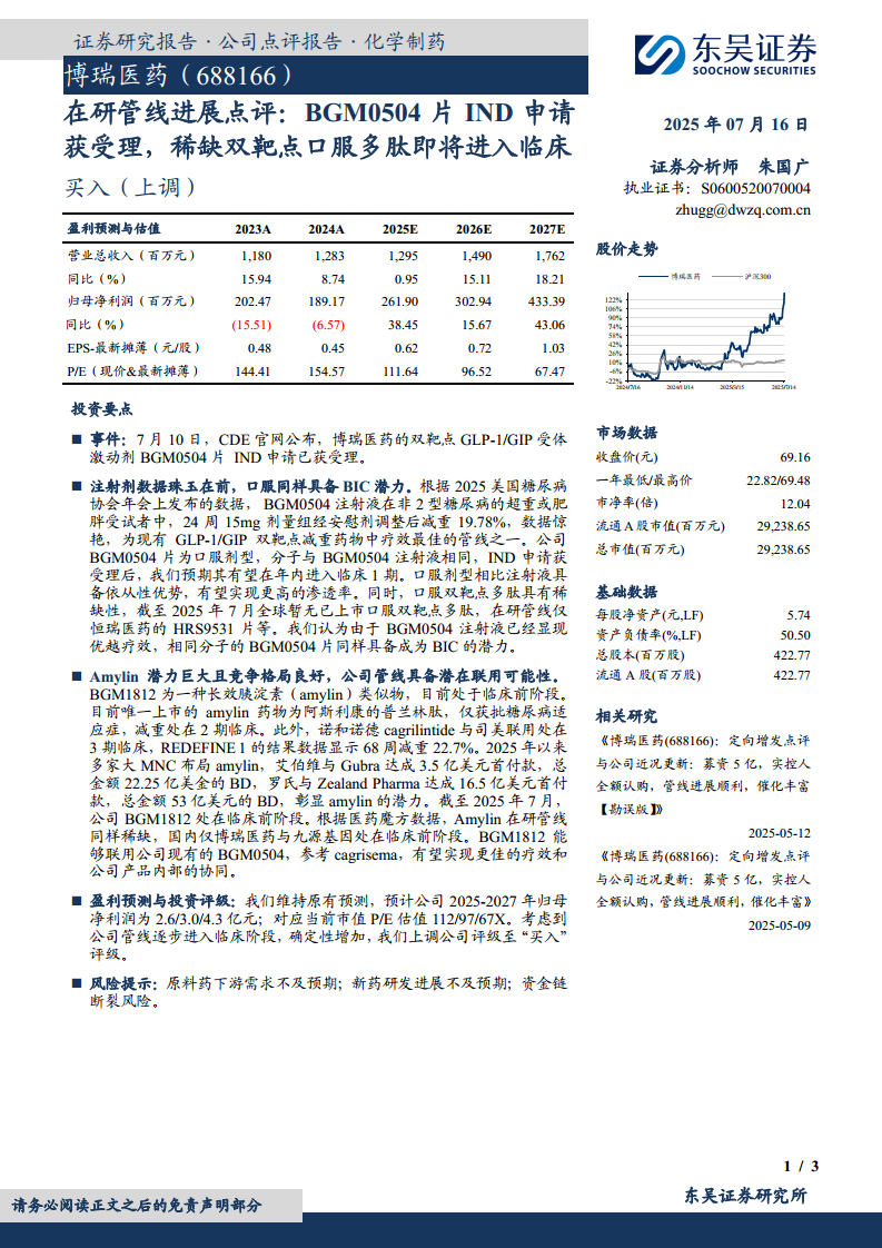 博瑞医药(688166):在研管线进展点评:BGM0504片IND申请获受理,稀缺双靶点口服多肽即将进入临床