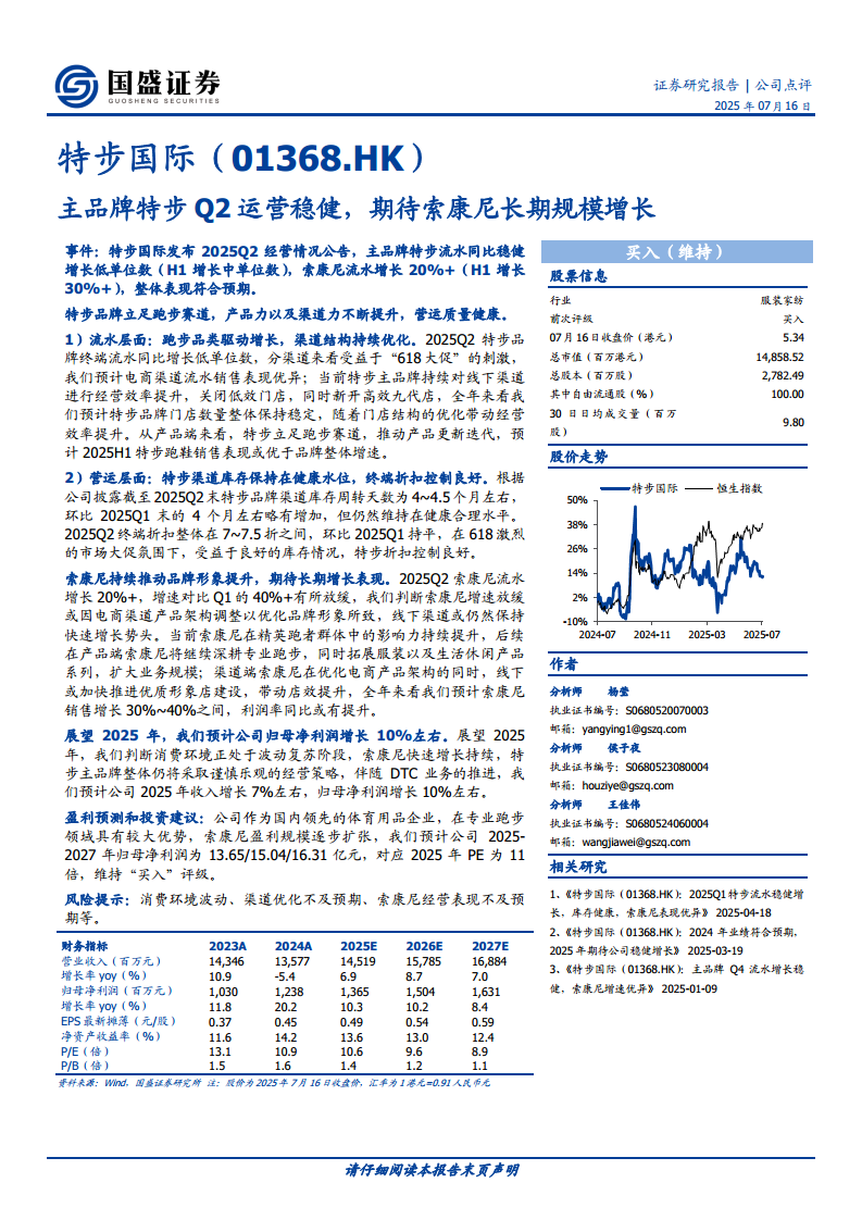 特步国际(01368):主品牌特步Q2运营稳健,期待索康尼长期规模增长