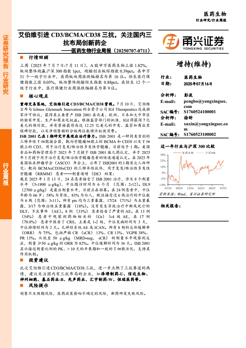 医药生物行业周报:艾伯维引进CD3 BCMA CD38三抗,关注国内三抗布局创新药企