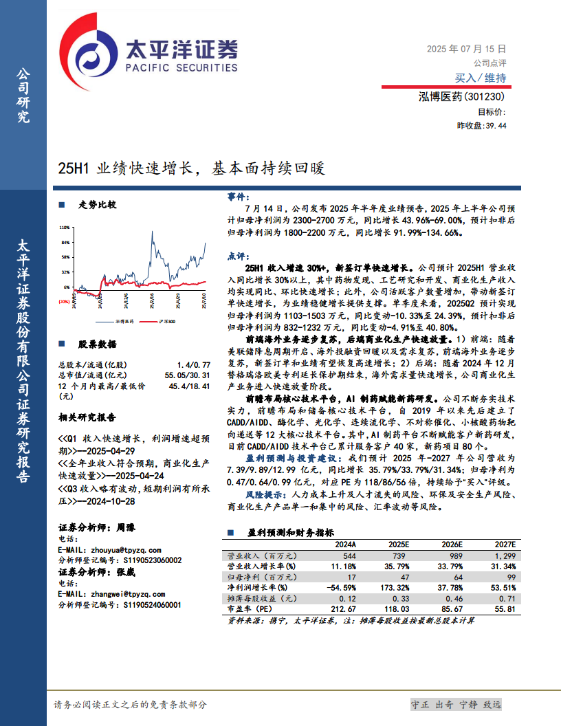 泓博医药(301230):25H1业绩快速增长,基本面持续回暖