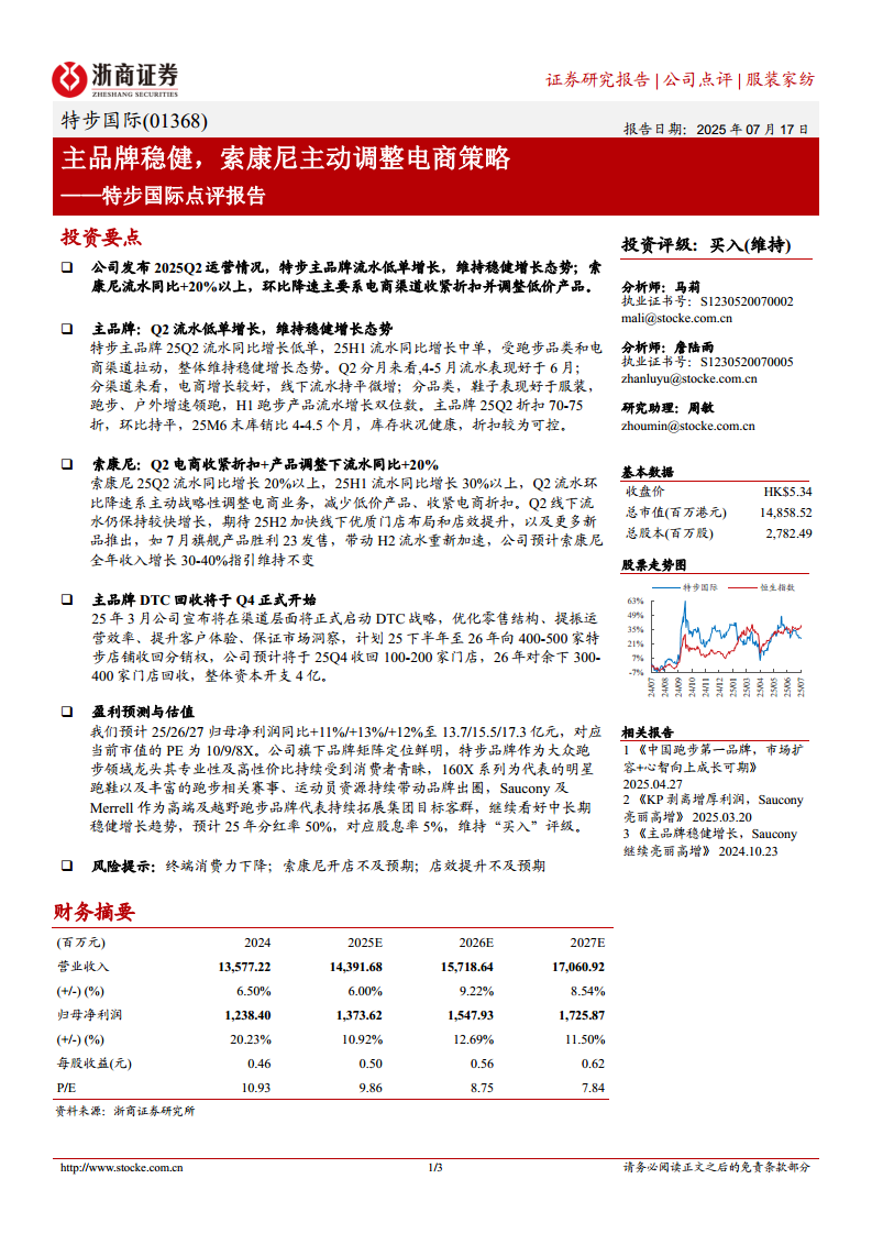 特步国际(01368):点评报告:主品牌稳健,索康尼主动调整电商策略