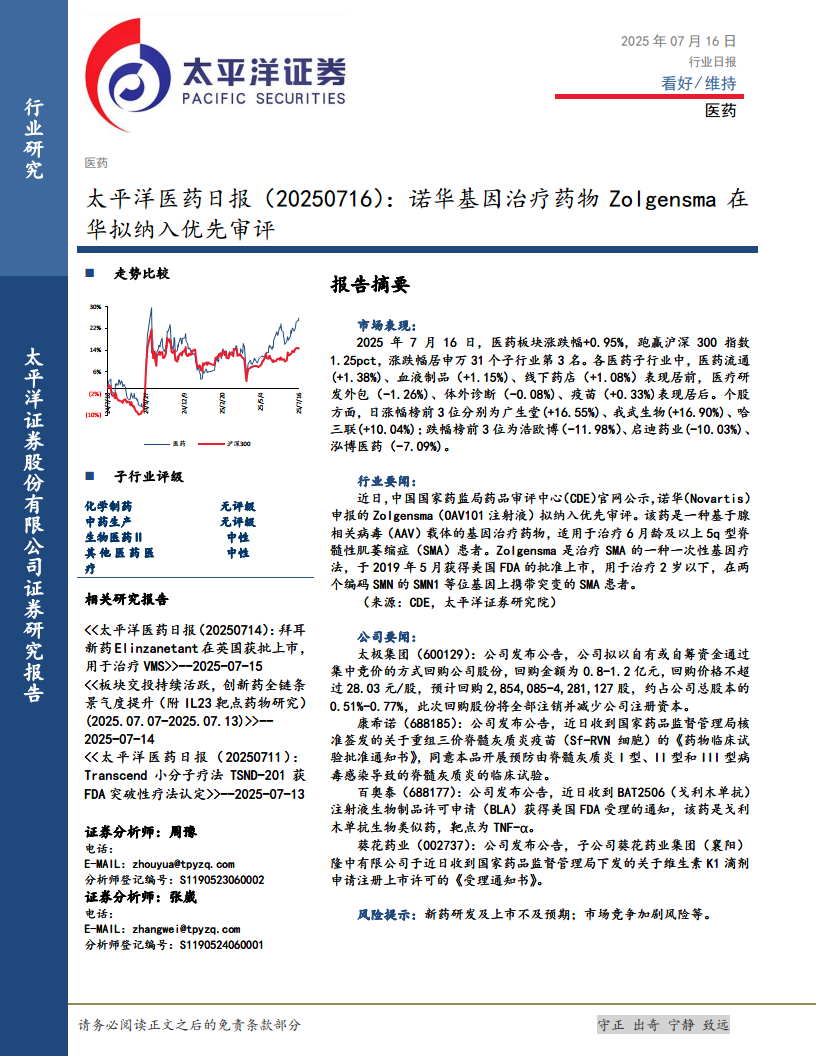 太平洋医药日报:诺华基因治疗药物Zolgensma在华拟纳入优先审评
