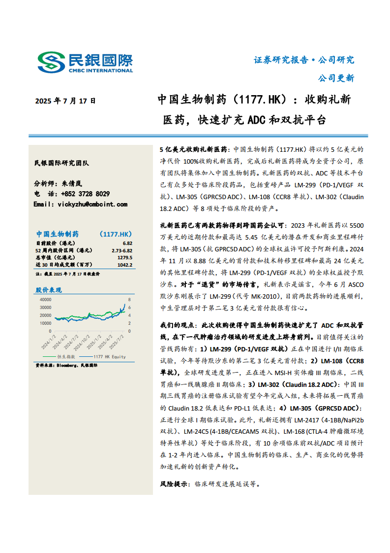 中国生物制药(01177):收购礼新医药,快速扩充ADC和双抗平台