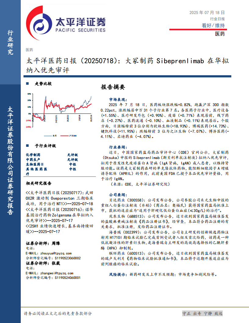太平洋医药日报(20250718):大冢制药Sibeprenlimab在华拟纳入优先审评