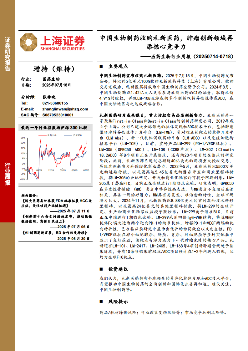 医药生物行业周报:中国生物制药收购礼新医药,肿瘤创新领域再添核心竞争力