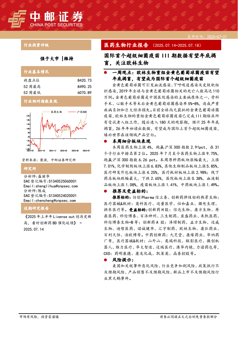 医药生物行业报告(2025.07.14-2025.07.18):国际首个超级细菌疫苗III期数据有望年底揭盲,关注欧林生物