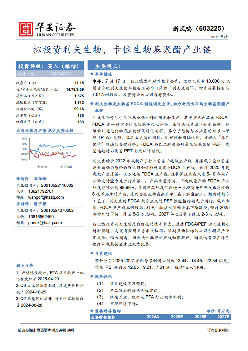 新凤鸣(603225):拟投资利夫生物,卡位生物基聚酯产业链