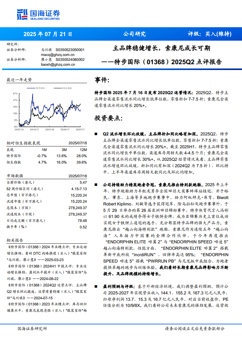 特步国际(01368):主品牌稳健增长,索康尼成长可期