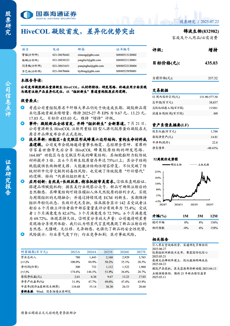 锦波生物(832982):HiveCOL凝胶首发,差异化优势突出