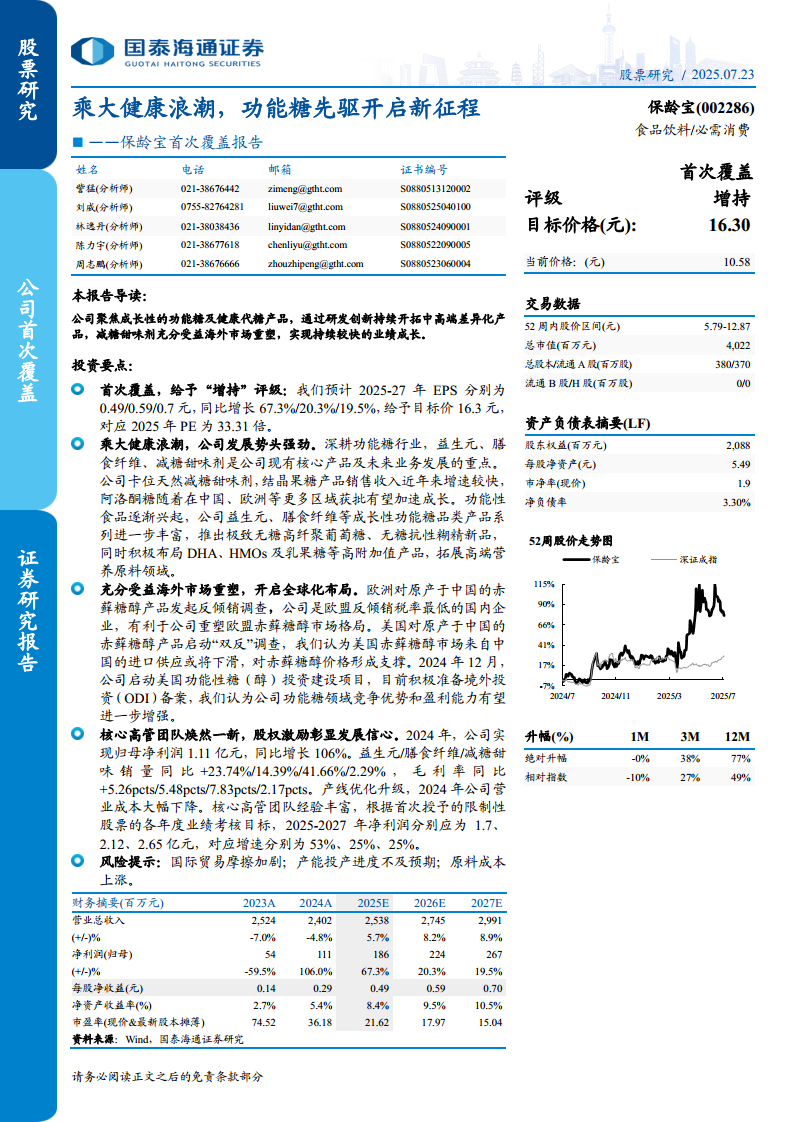 保龄宝(002286):首次覆盖:乘大健康浪潮,功能糖先驱开启新征程