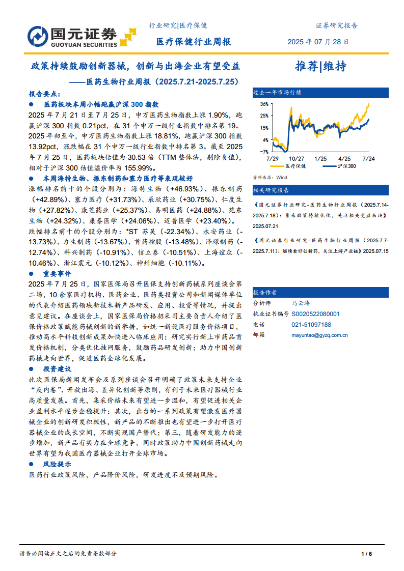 医药生物行业周报:政策持续鼓励创新器械,创新与出海企业有望受益