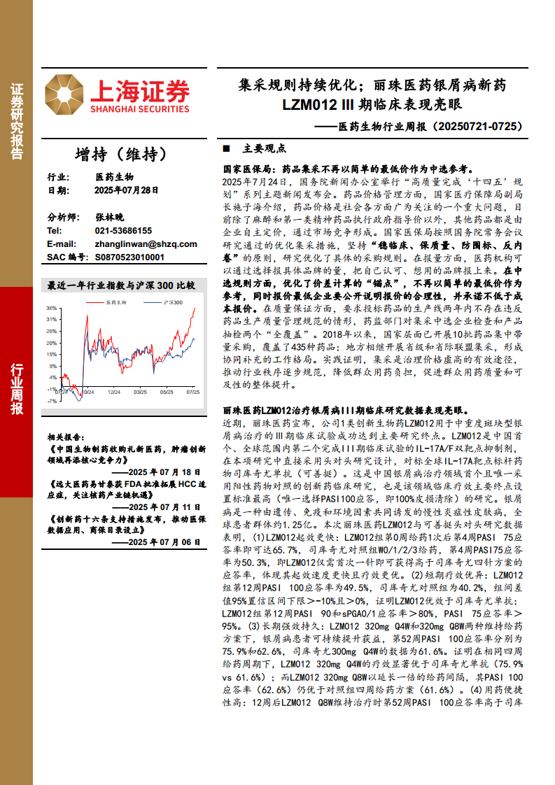 医药生物行业周报:集采规则持续优化,丽珠医药银屑病新药LZM012III期临床表现亮眼