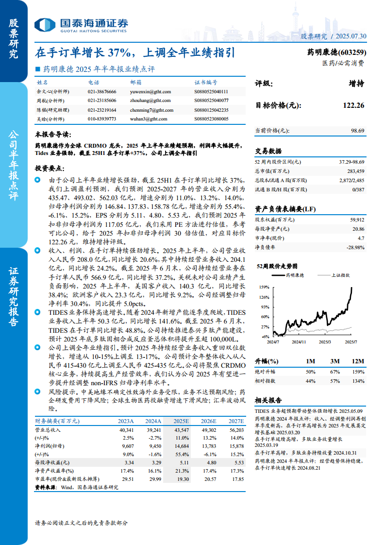 药明康德(603259):2025 年半年报业绩点评:在手订单增长37%,上调全年业绩指引