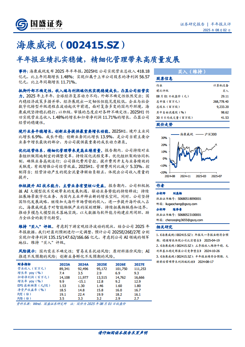 海康威视(002415):半年报业绩扎实稳健,精细化管理带来高质量发展