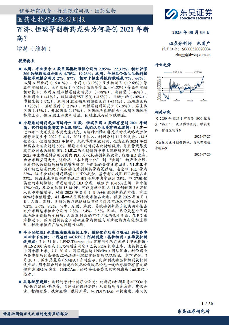 中期看创新药龙头百济神州H股、恒瑞医药A股都有望创2021年新高,它们创新高都需要上涨50%。我们认为主要有四点逻辑:1)其一近四年二大龙头基本面发生改变。百济神州泽布替尼头对头战略战胜伊布替尼发生于2022年4月,2021年收入、利润分别11.7亿美金、-14.5亿美金,但预期2025年扭亏,未来持续释放利润。恒瑞医药2024年创新药占比首次超过50%,预期未来创新药占比持续提升,并且管线厚度奠定公司未来持续BD。2)其二两次创新药牛市上涨逻辑不同。2021年、2025年主要逻辑分别为国内PD1为代表的创新药放量、战略BD出海,后者市场空间更大。这种从“本土商业化”到“出海”的产业升级,是我们认为创新药板块能够突破21年新高的关键支撑因素。3)其三中国目前已经是仅次于美国的优质创新药管线策源地,占全球FIC管线22%,24年全球创新药规模1.1万亿美金。基于前文我国FIC数量占比22%,假设未来中国创新药通过BD全球市占率达到25%,即2750亿美金的市场份额;考虑创新药BD分成一般位于10-15%区间,取中值12%分成,及公允估值15倍PE,可以贡献中国A+H股创新药3.6万亿人民币市值增量,对应2025年8月1日A+H股创新药总市值,有近80%的市值增量。4)其四从医药板块市值占比看,截至2025年8月1日,A股、港股、美股的医疗保健板块市值占对应市场总市值比分别为7.2%、5.6%、9.2%,其中,A股、港股、美股的创新药子板块的市值占对应市场总市值比分别为2.8%、2.4%、3.5%,因此,无论是整个医药板块还是创新药子板块,A股及H股的市值占比均低于美股,在BD出海推动下,国内创新药企业的研发管线价值与商业化能力有望加速释放,板块市值存在结构性增长机遇。