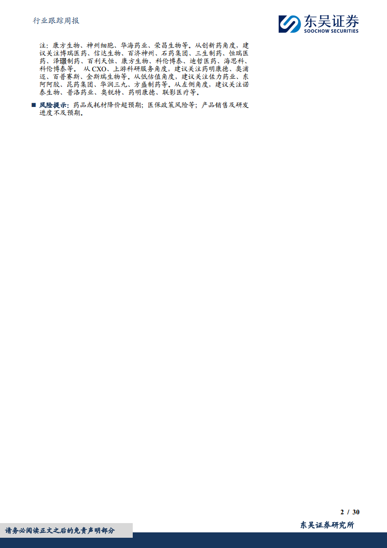 风险提示:药品或耗材降价超预期;医保政策风险等;产品销售及研发进度不及预期。