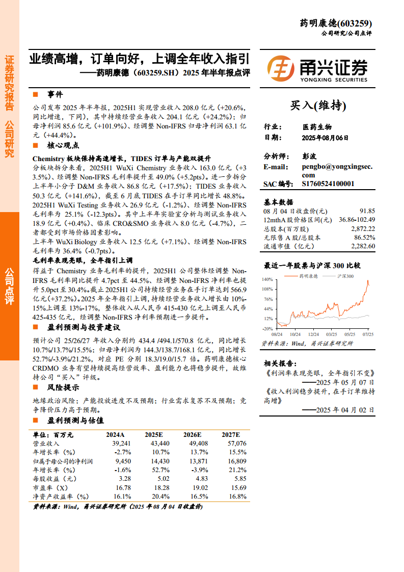 药明康德(603259):业绩高增,订单向好,上调全年收入指引