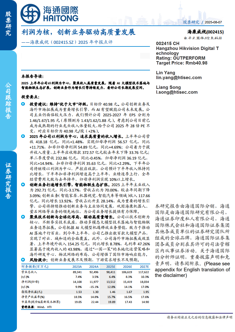 海康威视(002415):2025 年中报点评:利润为核,创新业务驱动高质量发展