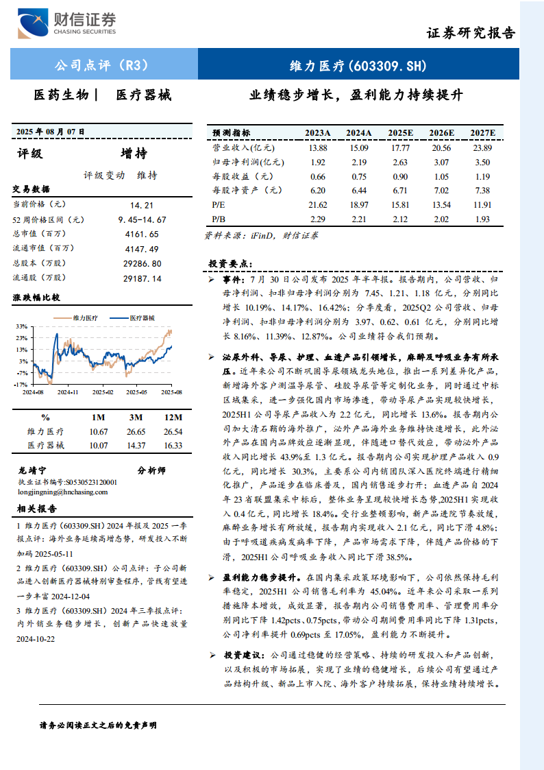 维力医疗(603309):业绩稳步增长,盈利能力持续提升