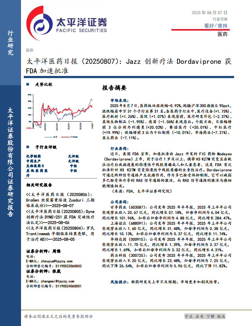 太平洋医药日报(20250807):Jazz创新疗法Dordaviprone获FDA加速批准