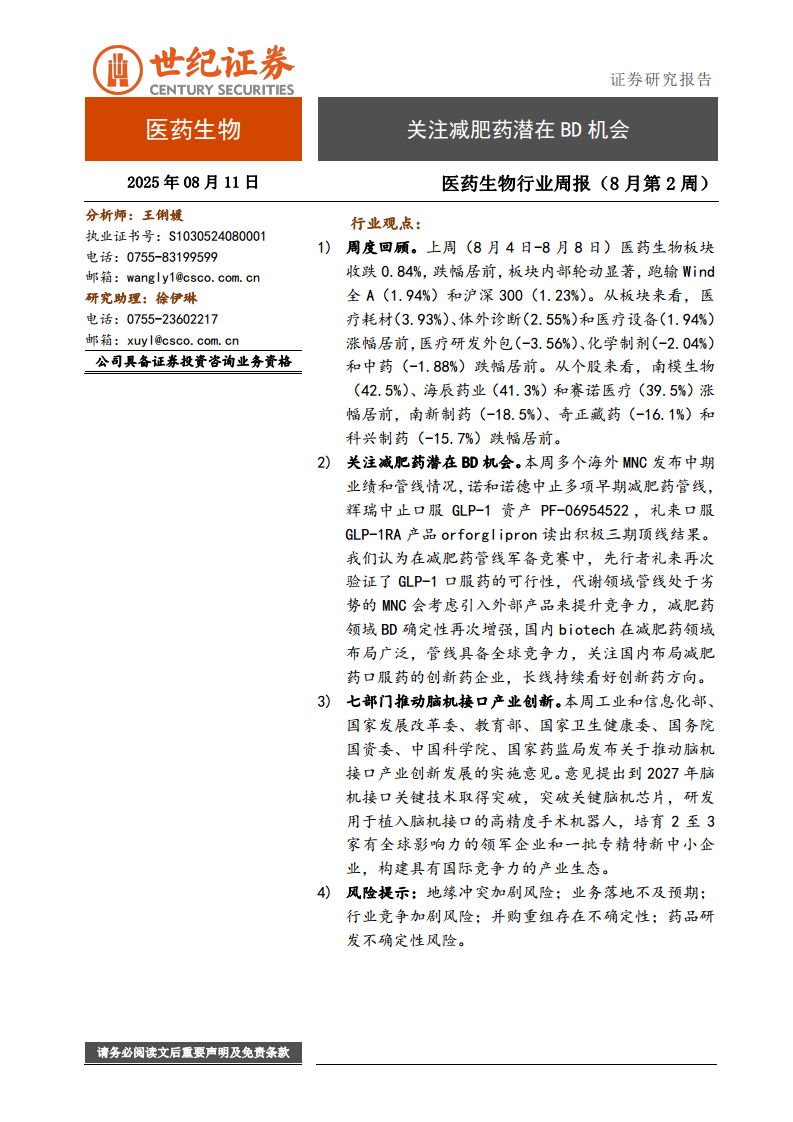 医药生物行业周报(8月第2周):关注减肥药潜在BD机会