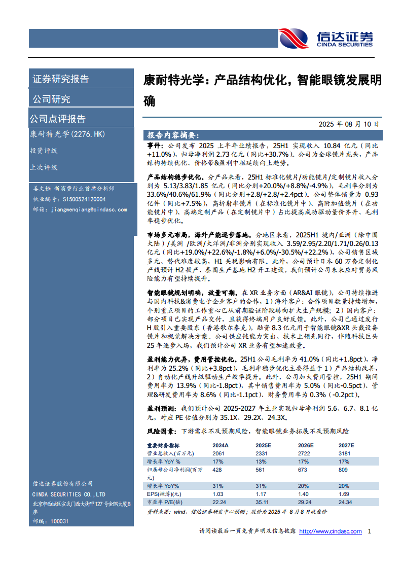 康耐特光学(02276):产品结构优化,智能眼镜发展明确