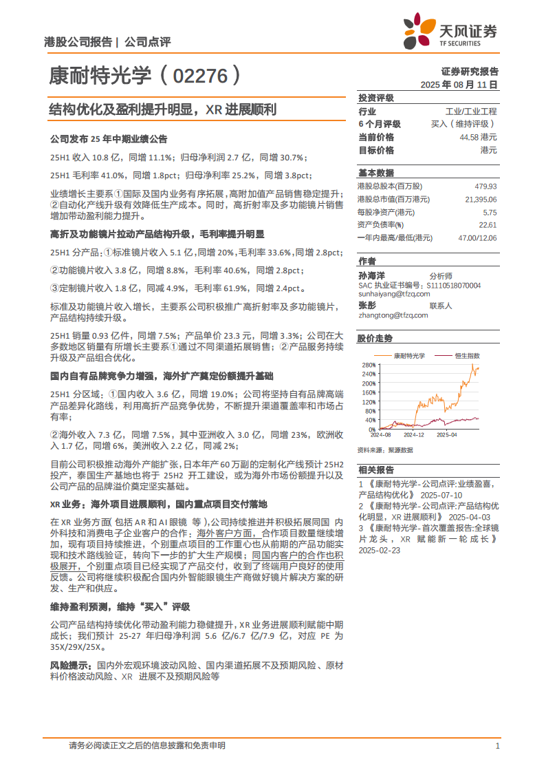 康耐特光学(02276):结构优化及盈利提升明显,XR进展顺利