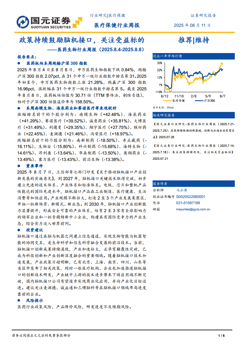 医药生物行业周报:政策持续鼓励脑机接口,关注受益标的