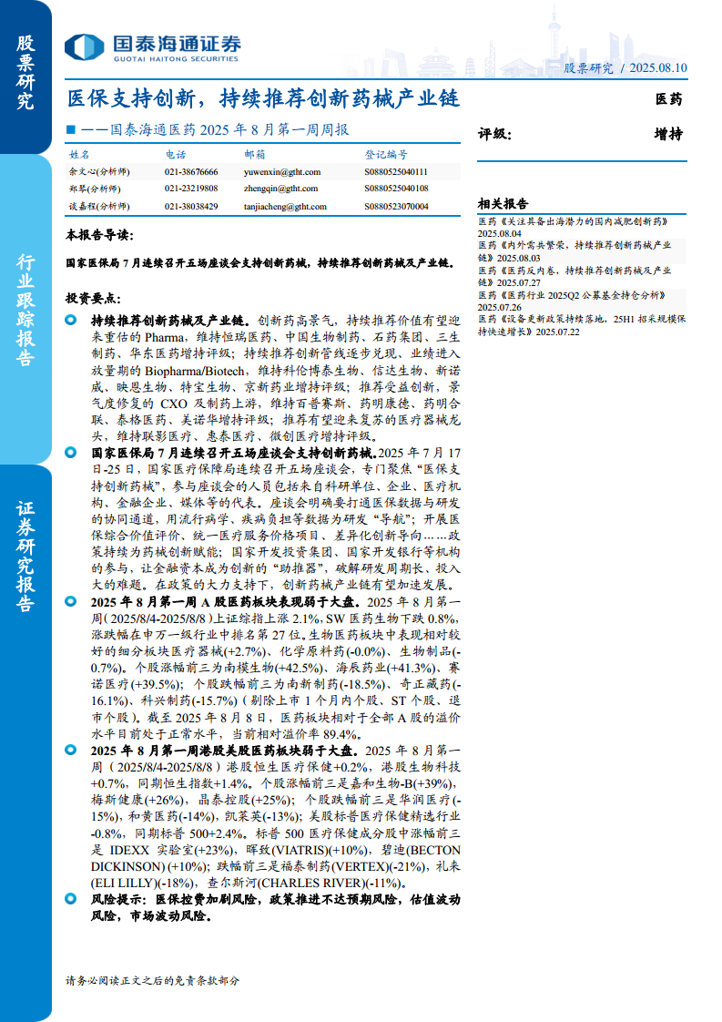 国泰海通医药2025年8月第一周周报:医保支持创新,持续推荐创新药械产业链