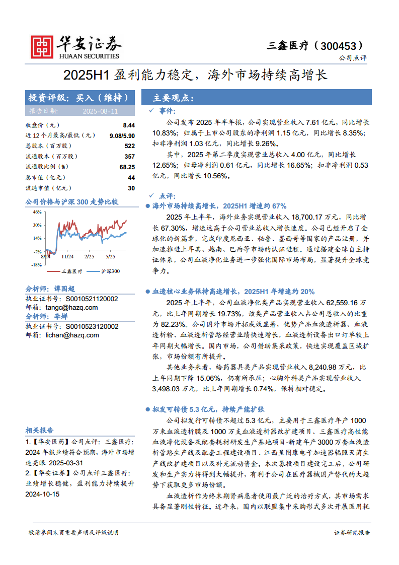 三鑫医疗(300453):2025H1盈利能力稳定,海外市场持续高增长
