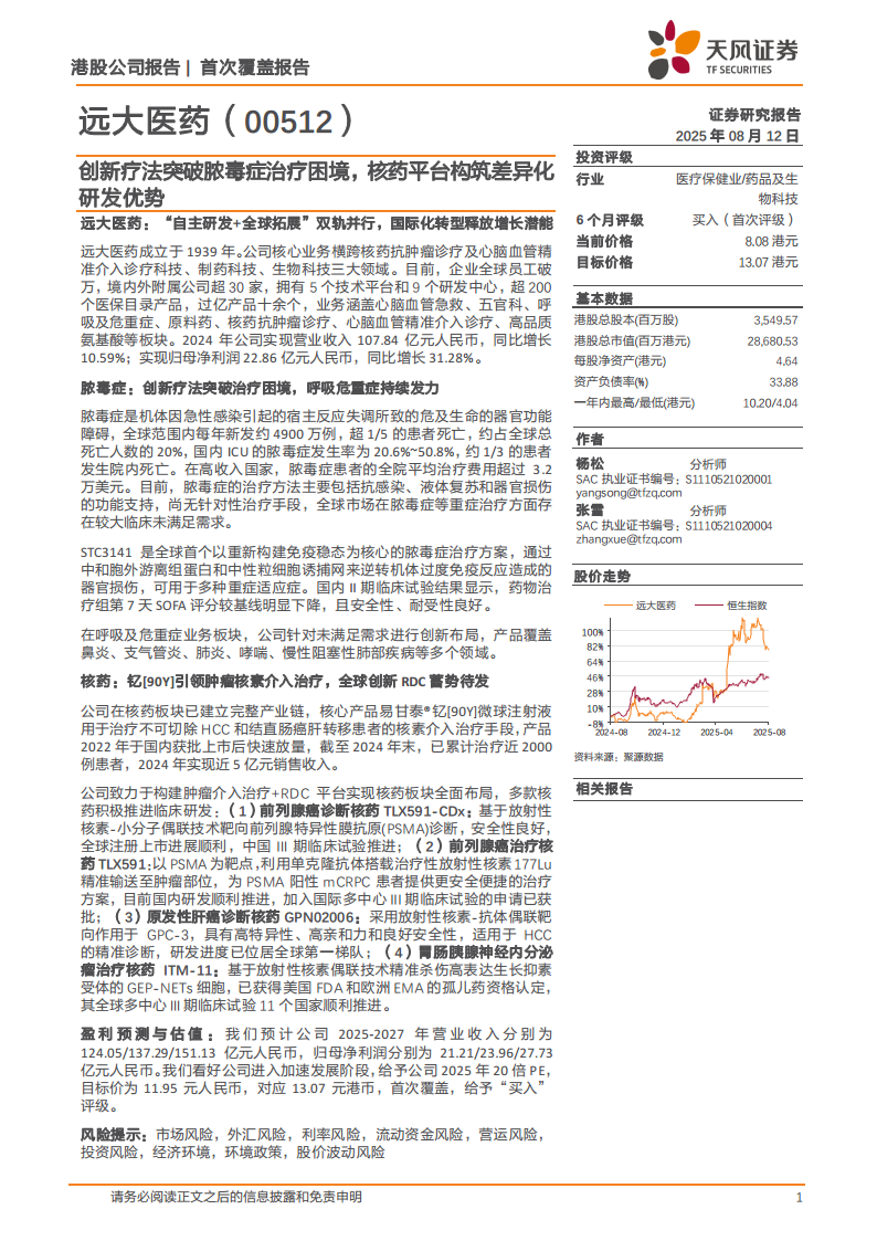远大医药(00512):创新疗法突破脓毒症治疗困境,核药平台构筑差异化研发优势