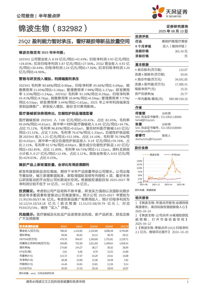 锦波生物(832982):25Q2盈利能力暂时承压,看好凝胶等新品放量空间