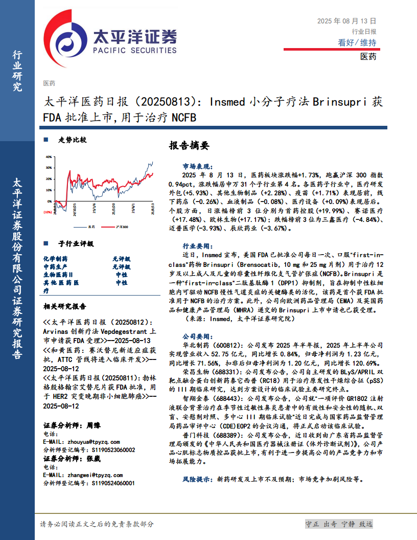 太平洋医药日报:Insmed小分子疗法Brinsupri获FDA批准上市,用于治疗NCFB