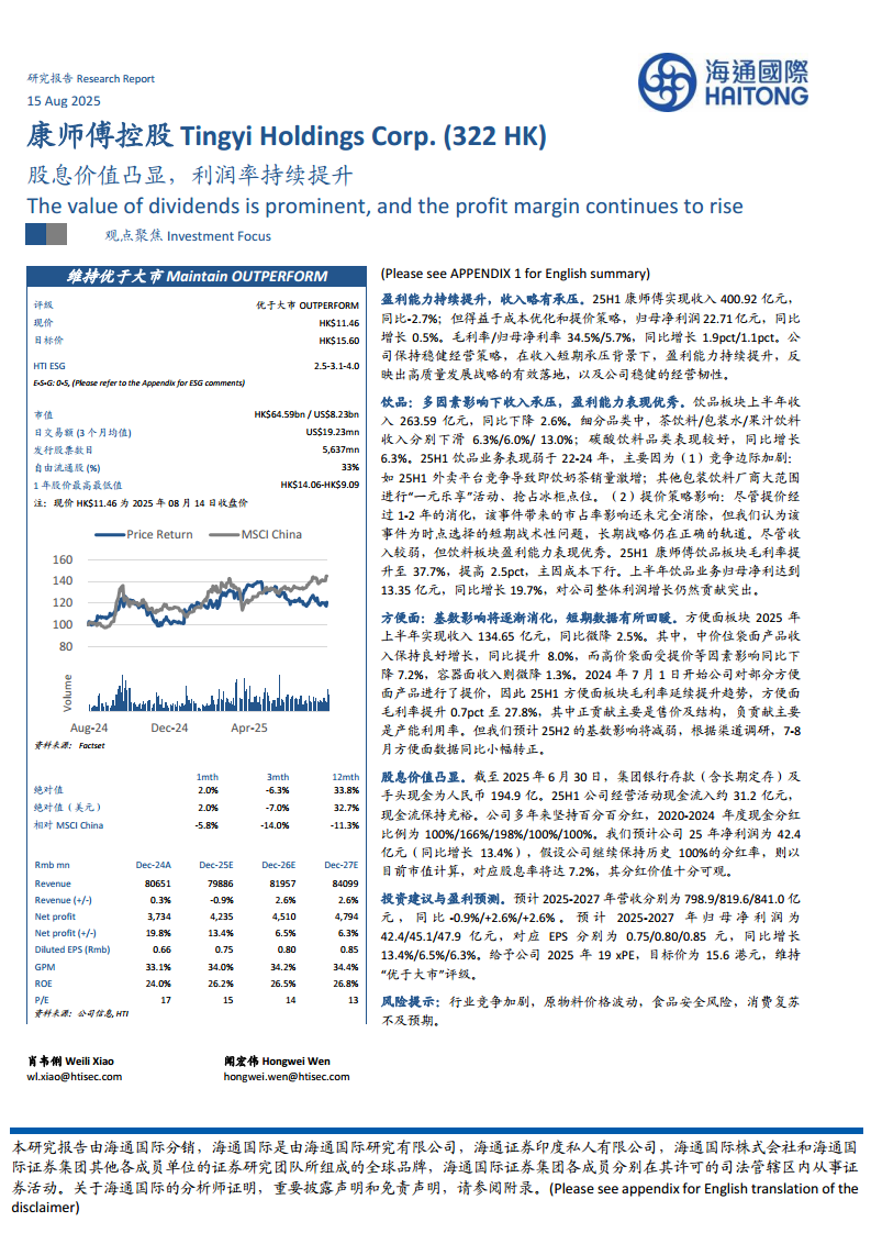 康师傅控股(00322):股息价值凸显,利润率持续提升