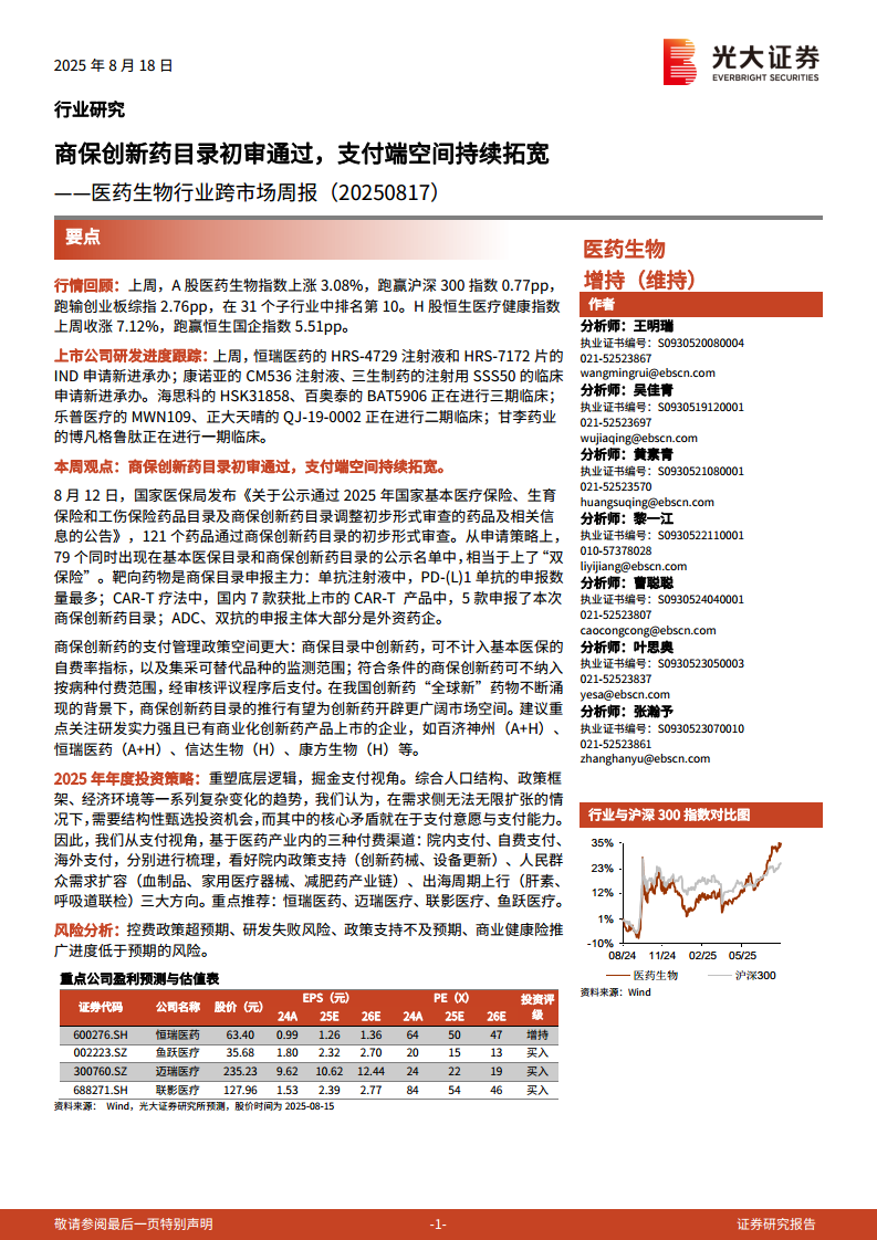医药生物行业跨市场周报:商保创新药目录初审通过,支付端空间持续拓宽