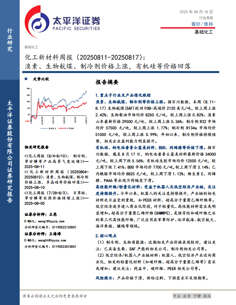 化工新材料周报:溴素、生物航煤、制冷剂价格上涨,有机硅等价格回落